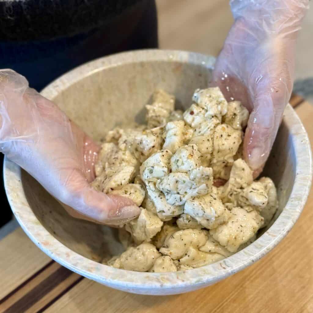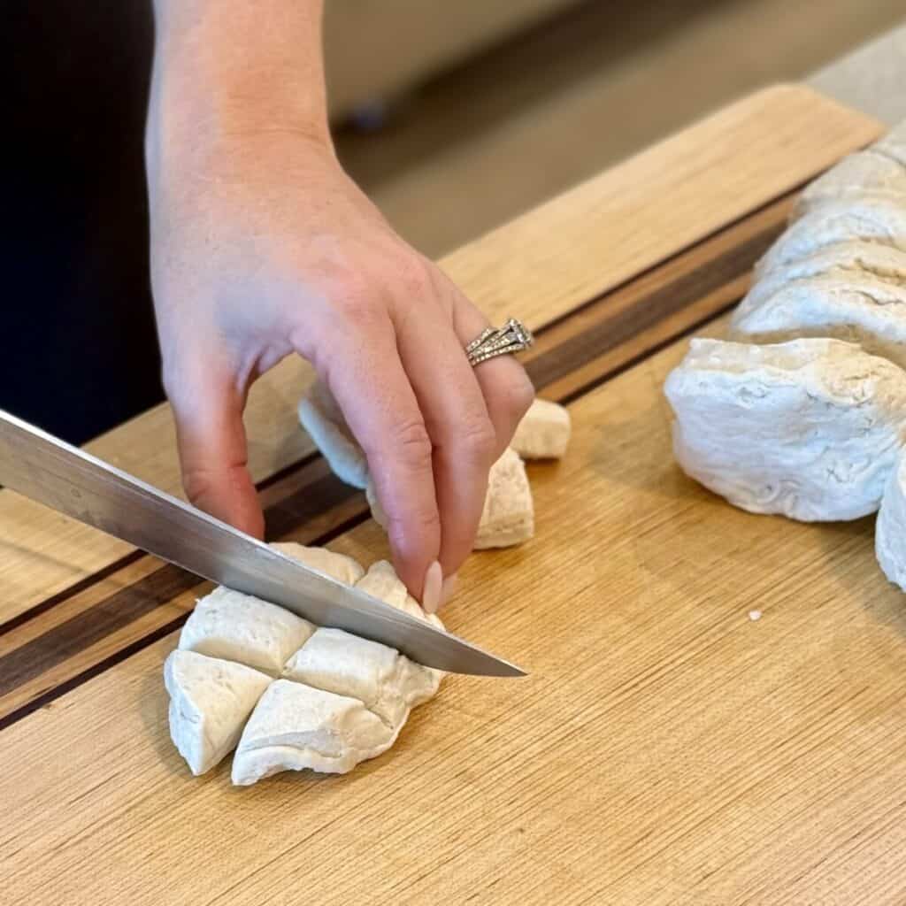 - Pour the butter mixture over the biscuit dough and toss gently until all the pieces are coated.