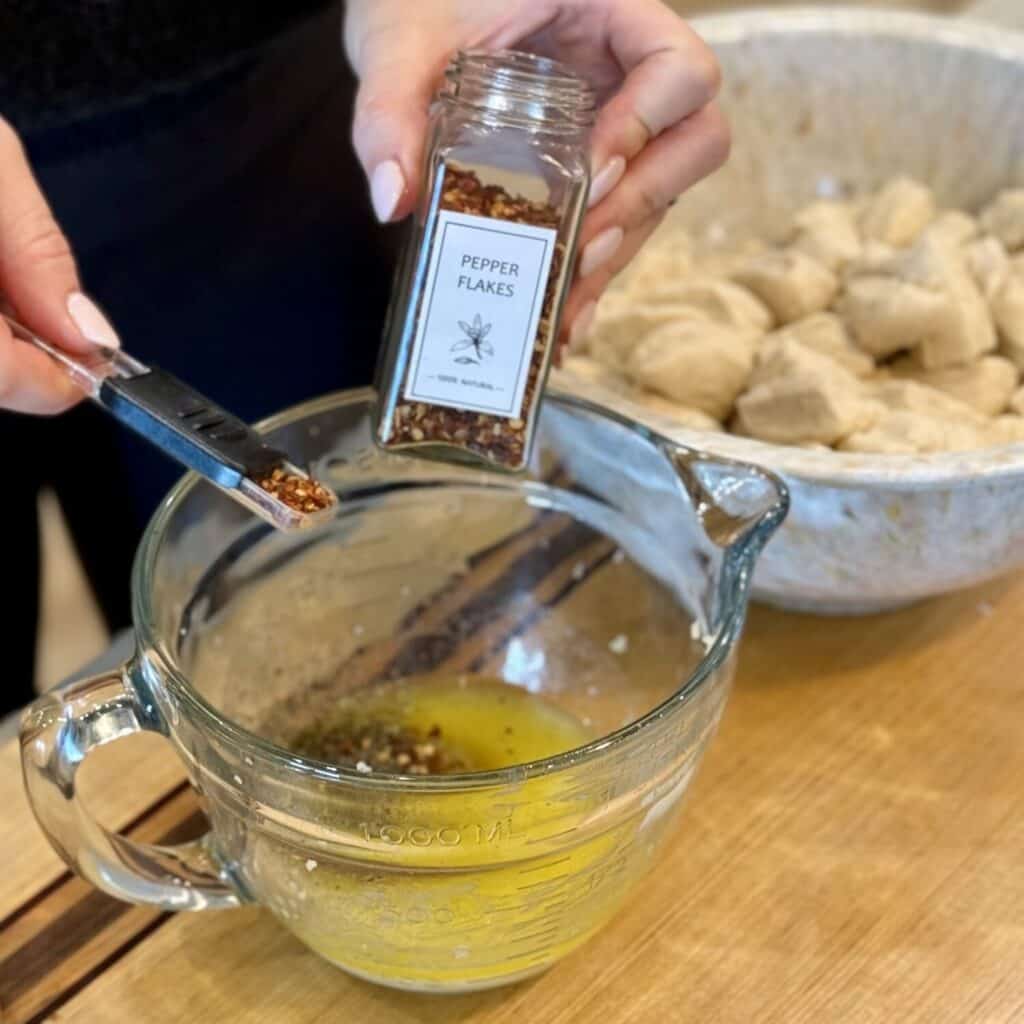 - In a small microwave safe bowl, melt butter. Once melted, mix with garlic, Italian seasoning, seasoning salt or salt and black pepper, and red pepper flakes.