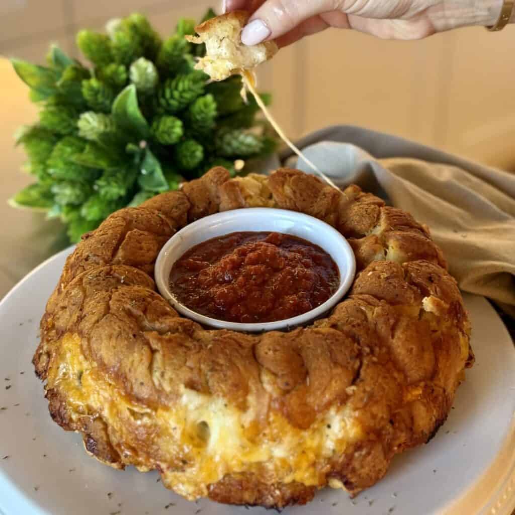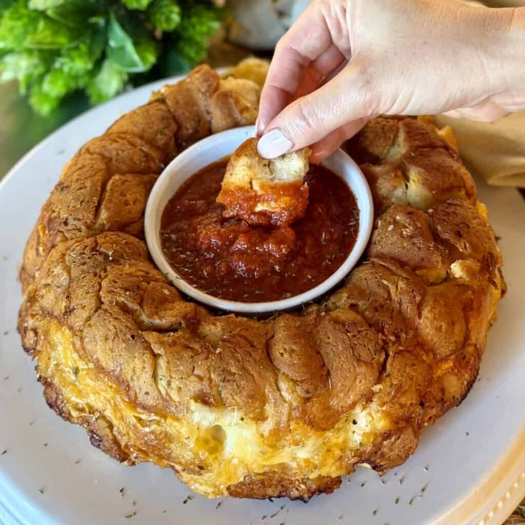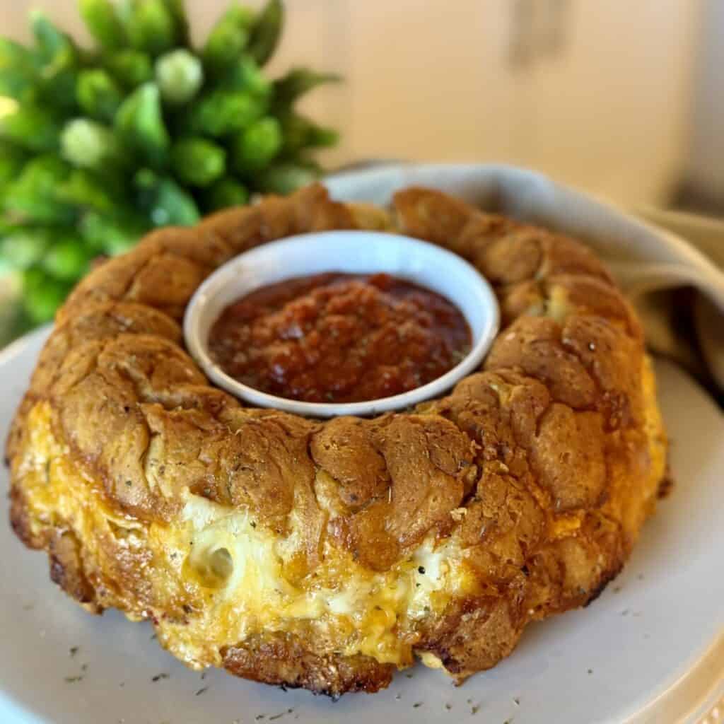 Now the only special thing you need to make this recipe is a Bundt Pan. I promise it’s so worth it for the presentation (and they’re easy to order online). By making it in this pan, I can put the dip in the center for a show-stopping look on the table. Serve with my Pizza Crescent Rolls or Cheese and Sausage Dip for the best spread.