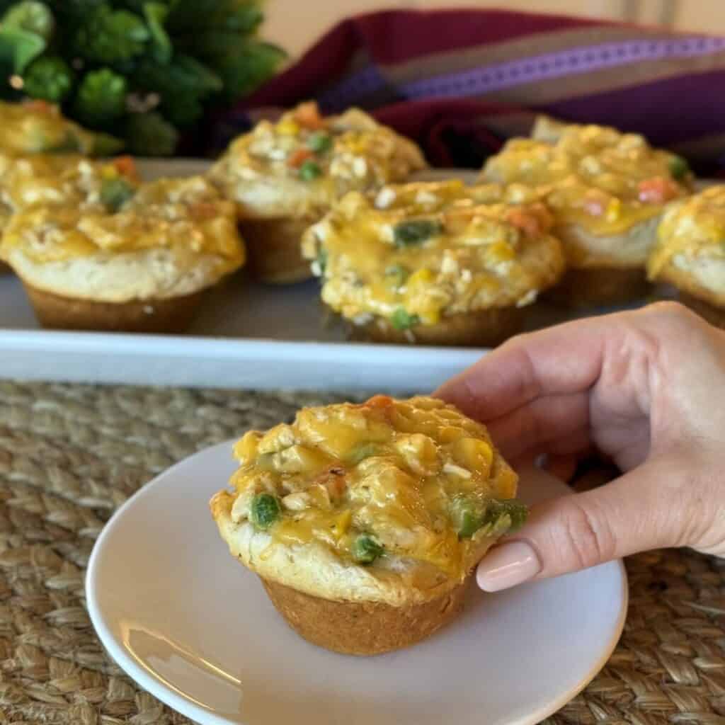 When developing the method, I wanted to make sure I could use a muffin tin. I lined each muffin cup with store-bought biscuits for the perfect crust. Filled with a classic creamy filling using rotisserie chicken, you can whip this comfort food recipe up in less than an hour.